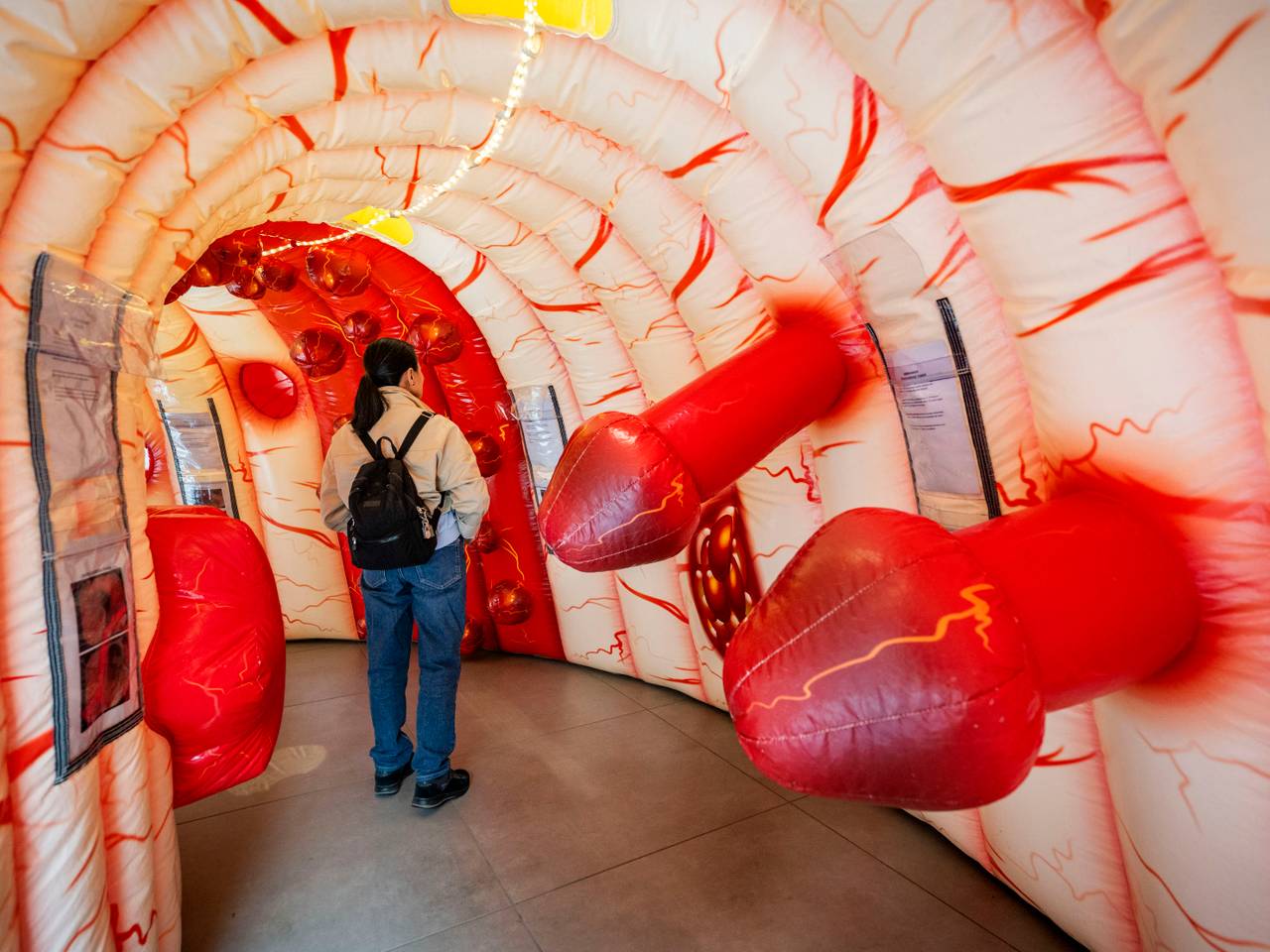 Deze ‘piemels’ in ziekenhuis zorgen voor grappen, maar het is iets anders8 uur geleden‘Lullig’ of ‘een overblijfsel van de Kamasutrabeurs’: een foto van het Amphia Ziekenhuis in Breda houdt veel mensen bezig. Bij de ingang staat een opblaasbare darm waar je doorheen kunt wandelen. En veel mensen denken piemels op de foto te zien.