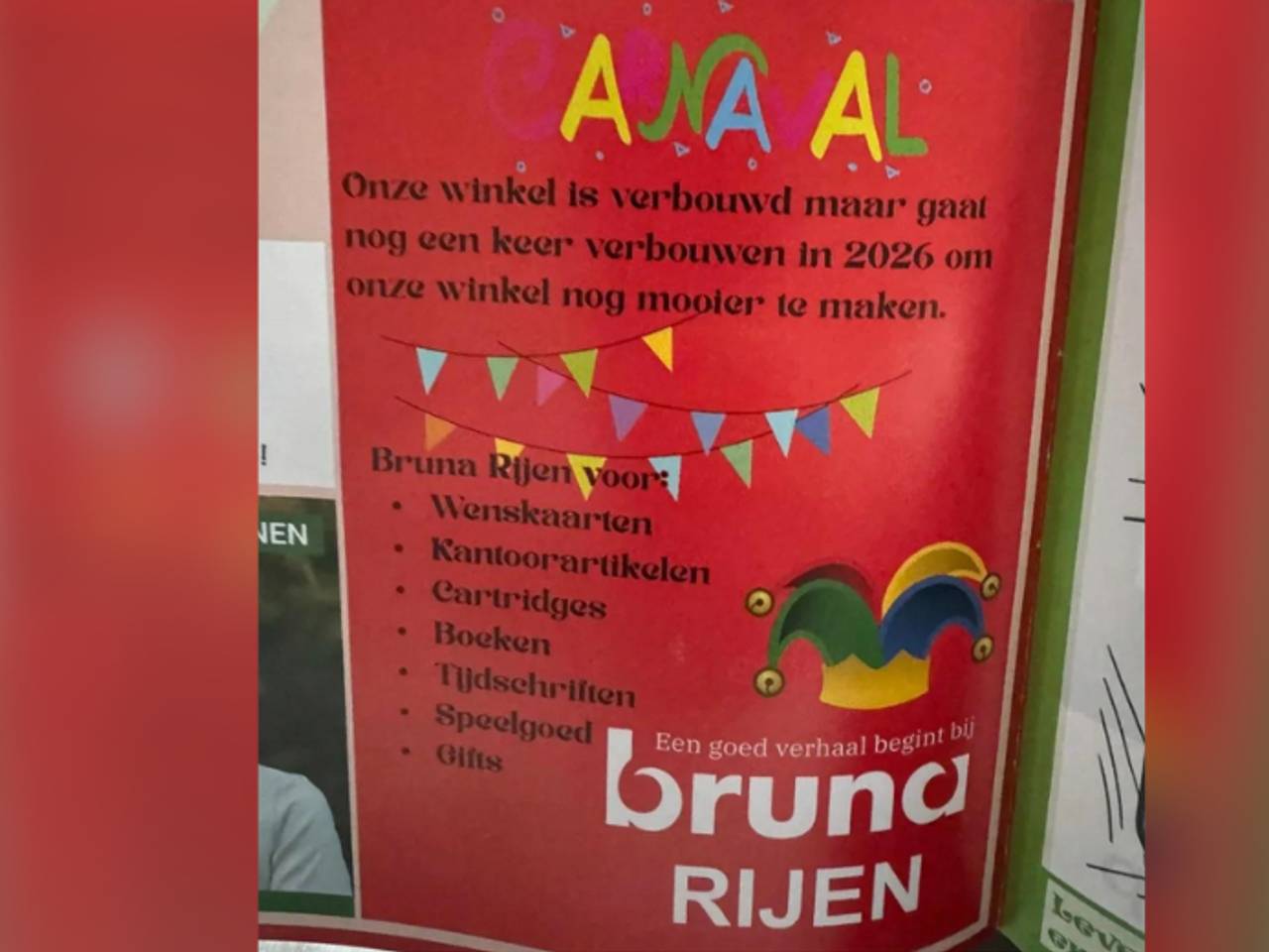 Drukfout in carnavalsadvertentie levert Bruna veel reacties op: 'Ongelukje'13 uur geledenDe aandachtige lezer ziet het meteen, maar de meeste mensen moeten toch twee keer kijken naar de carnavalsadvertentie van Bruna in het lokale wijkblad van Rijen. In vrolijk gekleurde letters lijkt er namelijk 'anaal' te staan, terwijl het natuurlijk om 'carnaval' gaat. "Op het originele ontwerp was het gewoon goed leesbaar", lacht een medewerker.