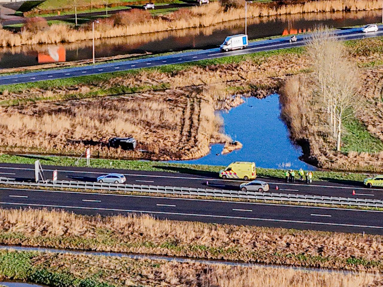 Crash op A59: auto slaat over kop en vliegt over sloot, bestuurder gewond6 uur geledenEen automobilist is woensdagochtend gewond geraakt bij een ongeluk op de A59 bij Waalwijk. De bestuurder raakte van de weg, sloeg over de kop, vloog over de sloot en kwam op de zijkant in niemandsland terecht.