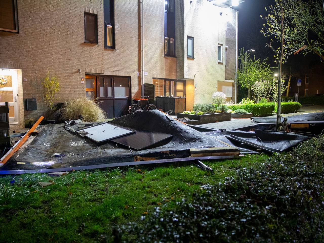 Dak waait van rij huizen in Roosendaal, ook zonnepanelen komen naar beneden3 uur geledenHet dak van een rij huizen is zondagnacht naar beneden gekomen aan de Kastanjeberg in Roosendaal. Oorzaak was de harde wind. Ook zonnepanelen kwamen naar beneden. Een deel belandde in een boom.