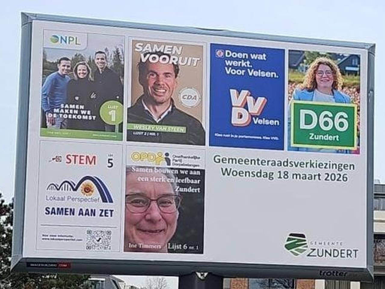 VVD Zundert zoekt zichzelf: Velsen op verkiezingsborden11 uur geledenIn de gemeente Zundert hangen niet de verkiezingsposters van de VVD Zundert, maar van de VVD Velsen op de borden. Een opmerkelijke fout. Op de poster had eigenlijk een foto moeten staan van lijsttrekker Rachel Oostvogels, maar zij is niet te vinden op de posters die er nu hangen. “Het is wel komisch maar ook heel jammer”, vertelt Oostvogels.