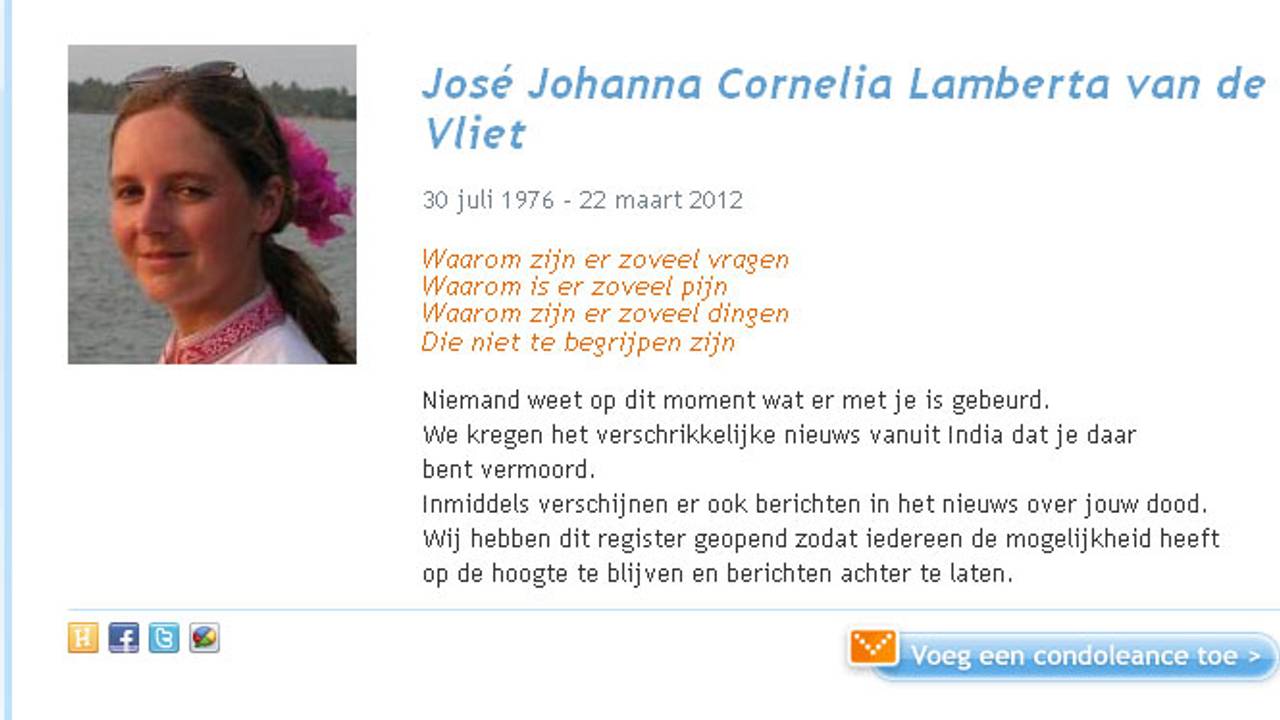 Het lichaam van de 35-jarige hulpverleenster José van de Vliet uit Waalre is gevonden in India. Dat meldt het AD. Zij is onder verdachte omstandigheden om het leven gekomen.