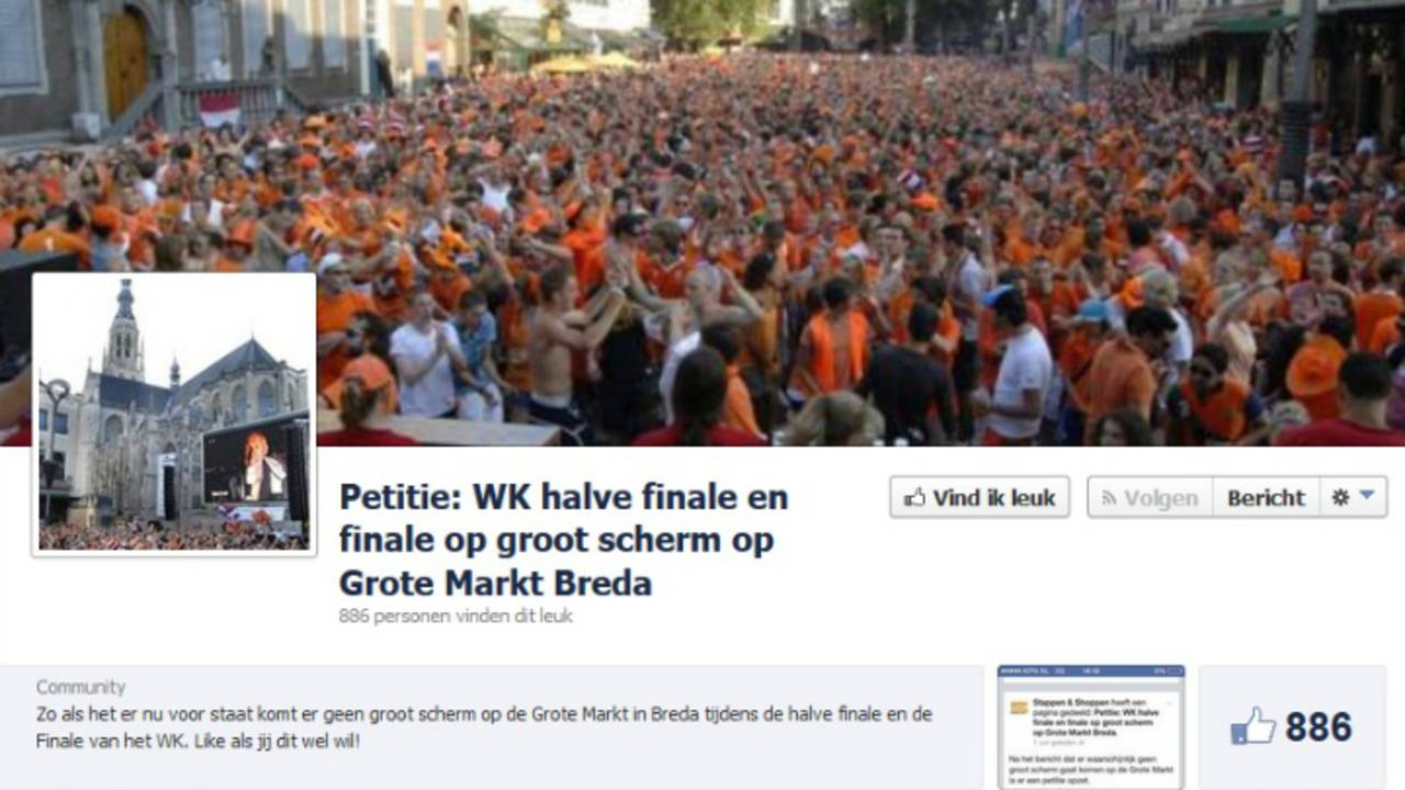 Een groep Bredase voetballiefhebbers heeft een Facebookpagina geopend met een petitie voor het vertonen van WK-voetbal op de Grote Markt. Zij kunnen het niet verkroppen dat de halve finale en de finale van het WK niet op grote schermen te zien zijn.