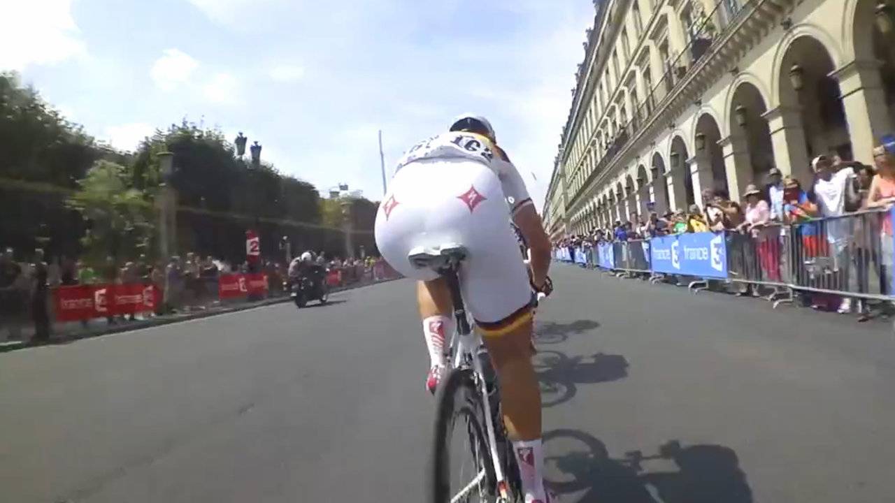 Marianne Vos won afgelopen zondag 'La Course' in hartje Parijs. Dat het niet allemaal vanzelf gaat, is goed te zien op de beelden vanaf het zadel van de wielrenster uit Meeuwen.