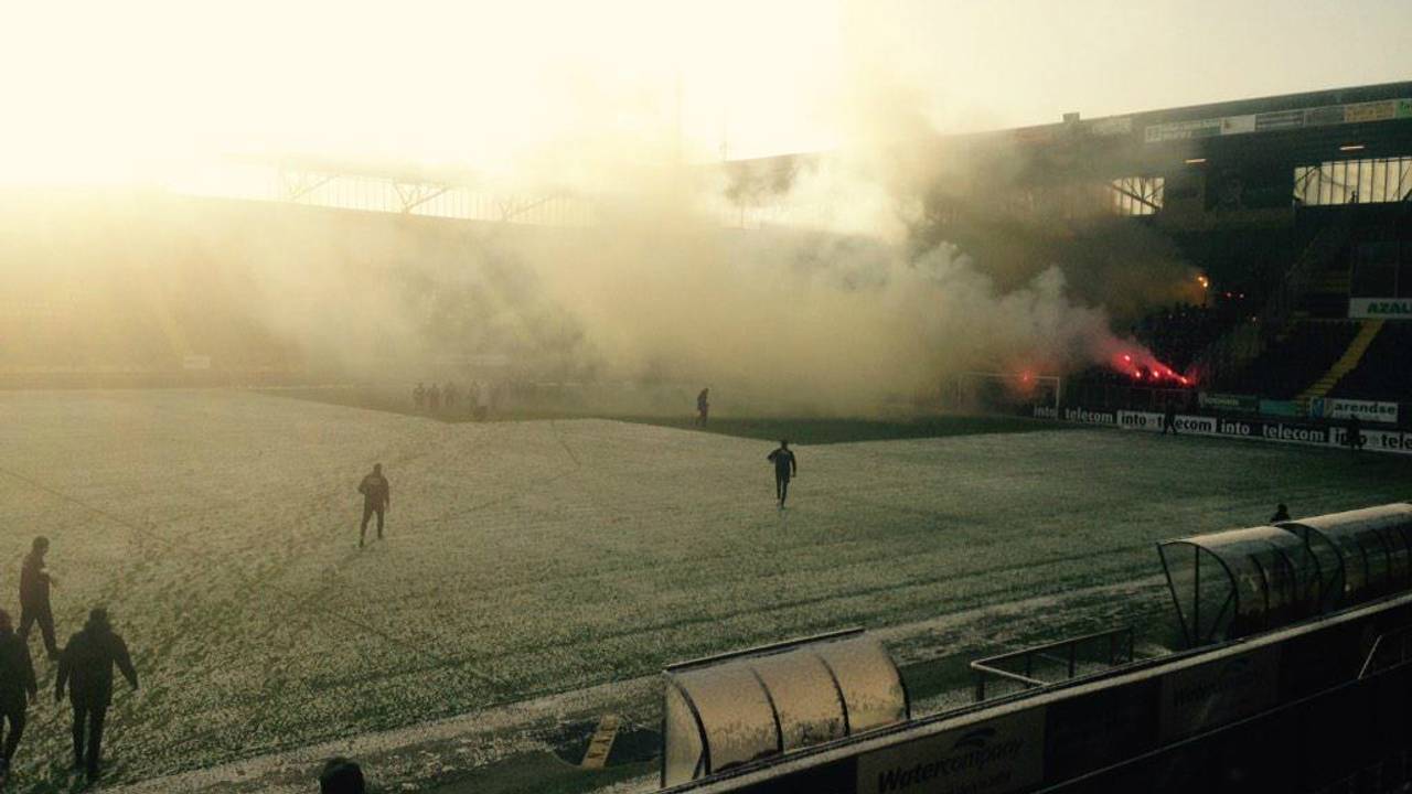 Klaar voor de strijdDoor de rook van de rode fakkels was het zicht beperkt, maar de strijdlust aan beide kanten werd flink aangewakkerd. Honderden supporters kwamen op de trainingen af.[Tweet:body:https://twitter.com/FanzineDeRat/status/558927148267077632][Tweet:body:https://twitter.com/KingZine/status/558920731153932288]