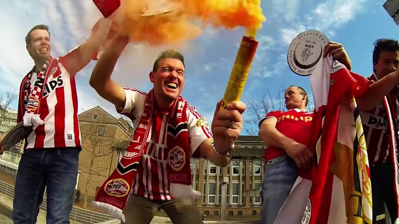 Het Stadhuisplein in extase. Dat moet ook dit jaar het doel zijn. PSV dendert in sneltreinvaart richting de 22e landstitel. Reden genoeg voor een paar fanatiekelingen om alvast te oefenen hoe je ook alweer een landstitel viert.