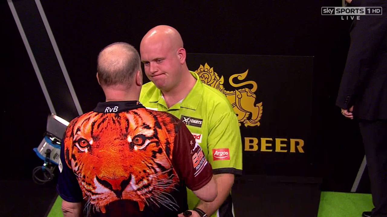 De strijd tussen 'Mighty Mike' en 'Barney' ging gelijk op tot 4-4. In de tiende leg, die Van Gerwen was begonnen, stevende Van Barneveld op een negendarter af. Hij miste echter de negende dart, maar maakte het wel met de tiende af.