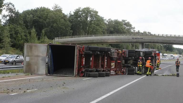 Rond halfvier vrijdagmiddag kantelde een vrachtwagen op de A4 bij Halsteren. De vrachtwagen was geladen met hoogovenafval. Dat belandde op de weg.