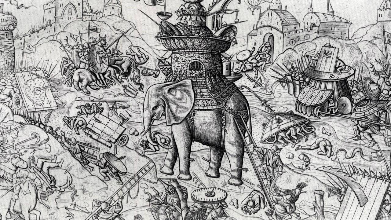 De KrijgsolifantNummer vijf is ooit verdwenen. De naam is bekend: 'De Krijgsolifant'. Het zou logisch zijn als dat net zoals de andere vier metersgrote wandtapijten een schilderij van Jeroen Bosch zou zijn. Maar ook van dat schilderij is niet bekend waar het is gebleven. Olifanten werden voor Christus al gebruikt bij veldslagen en belegeringen. In de loop der eeuwen zijn er veel schilderijen gemaakt van krijgsolifanten.