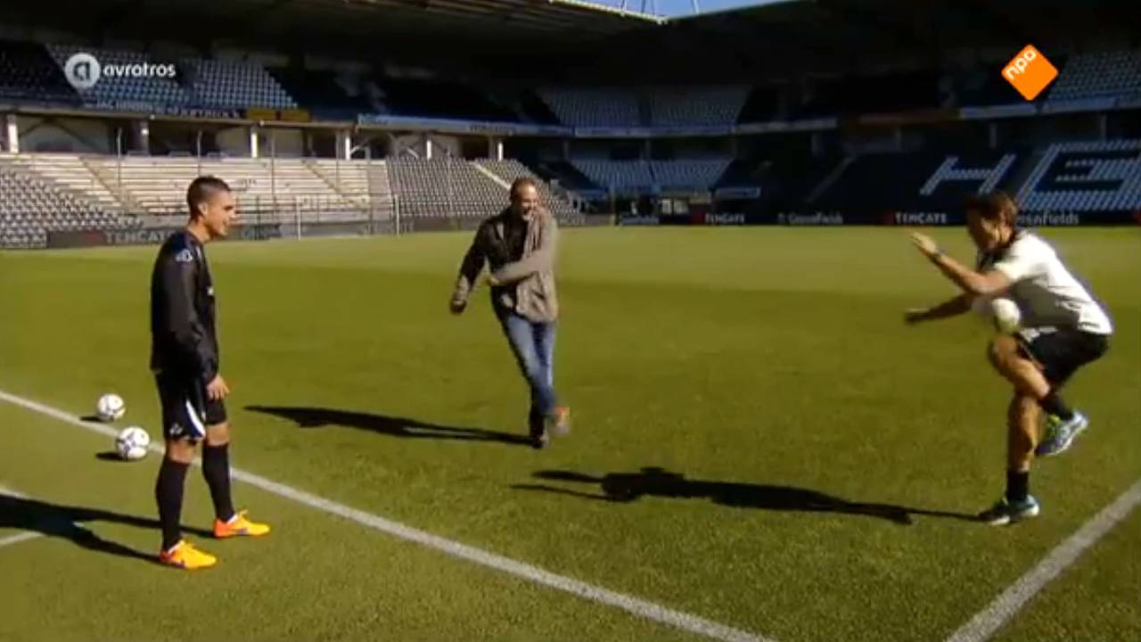 Ben je er klaar voor?En in diezelfde aflevering gaat Frans Bauer dus ook even voetballen met wat spelers van Heracles. "Balletje trappen met Frans, ik ben benieuwd", zegt aanvoerder Fledderus nog. "Nou, daar komt ie. Ben je er klaar voor?", kondigt Frans z'n kanonskogel aan.