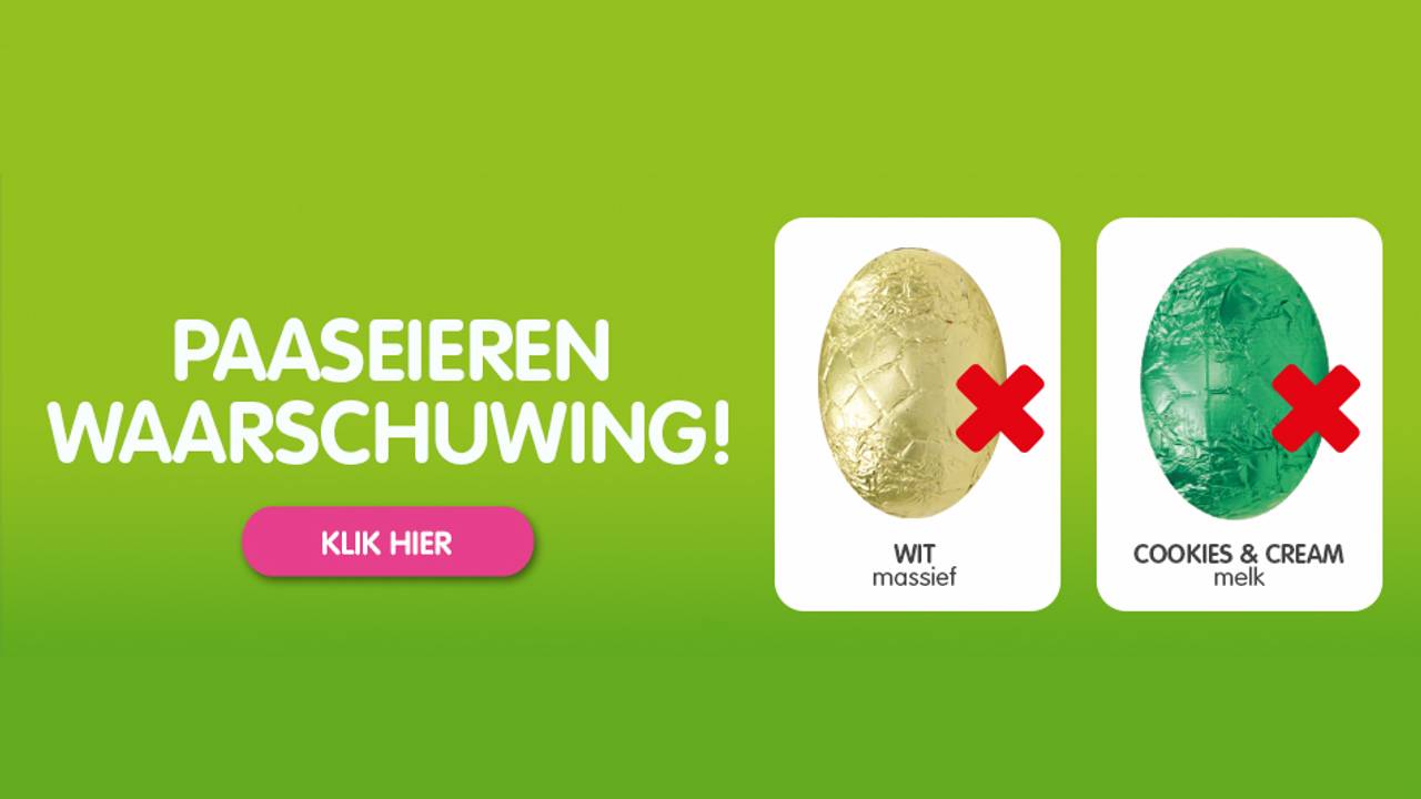 In de smaken 'cookies& cream' en 'massief wit' kan het plastic zitten. Het gaat om eitjes met een gouden en een groene wikkel.