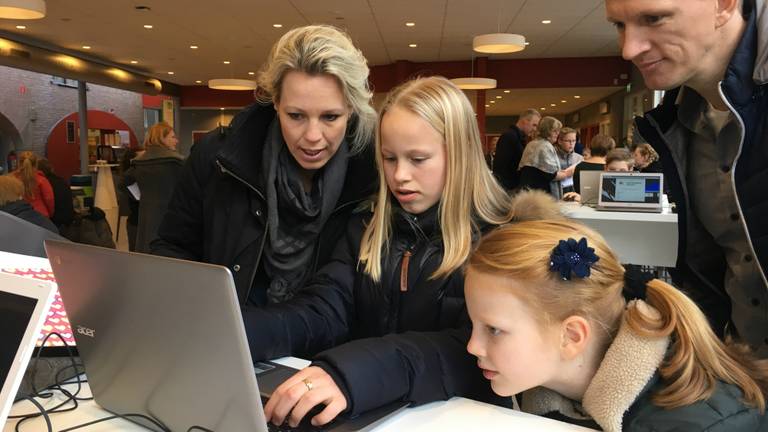 In de aula van het Odulphus is het druk. Kinderen met hun ouders zitten achter laptops om zich in te schrijven voor het nieuwe schooljaar. Een medewerker van de ICT probeert nog extra computers bij te plaatsen, omdat ze constant bezet zijn.