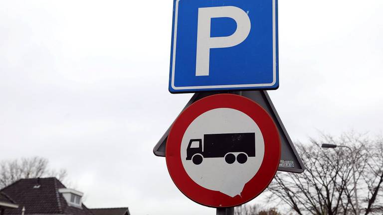 Een opmerkelijke combinatie van verkeersborden zorgt voor verwarring in Oss. Op de hoek van de Kromstraat en Hertogin Johannasingel is een vierkant blauw bord met een witte P te zien, met pal daaronder een inrijverbod voor vrachtwagens.