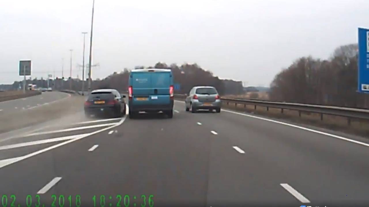 Te zien is hoe een zwarte auto op het laatste moment en met hoge snelheid probeert in te voegen. Dit gebeurt zo roekeloos dat een bestelbusje moet uitwijken en tegen een auto die op de andere rijbaan aankomt.