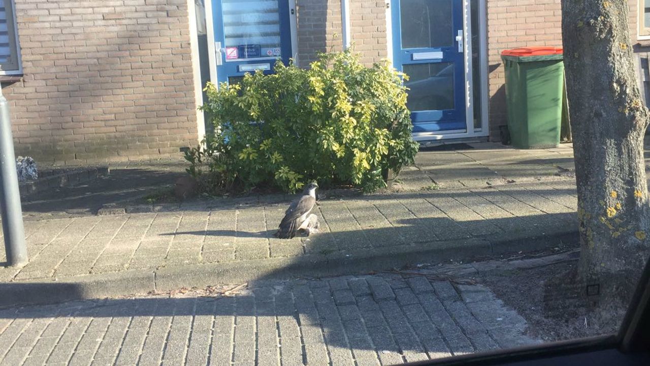 Op de foto die ik kreeg van Henk Janssen zie je een grijzige vogel op de stoep zitten. Ik vermoed op een prooi. De vogel die je ziet, is een sperwer en in dit geval een vrouwtje. Doordat de sperwer brede, korte vleugels en lange poten heeft, is het een roofvogel die gemakkelijk vogels in tuinen maar ook in het bos kan vangen. Op het menu staan bij het mannetje vooral zangvogels. Vaak mussen, mezen en spreeuwen. Het vrouwtje pakt - omdat ze groter is - ook grotere vogels, zoals Turkse tortels en stadsduiven.
