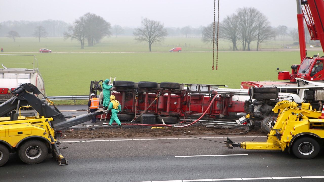 Voor het overpompen van de bijtende stof - natronloog - is door Rijkswaterstaat een gespecialiseerd bedrijf opgeroepen. Dat begon rond halftwaalf met het legen van de truck. "Maar dit duurt langer dan verwacht", liet Rijkswaterstaat vrijdagmiddag weten. De brandweer bleef lange tijd stand-by. Natronloog kan bij aanraking met de huid weefselbeschadiging, jeuk of ernstige brandwonden veroorzaken.