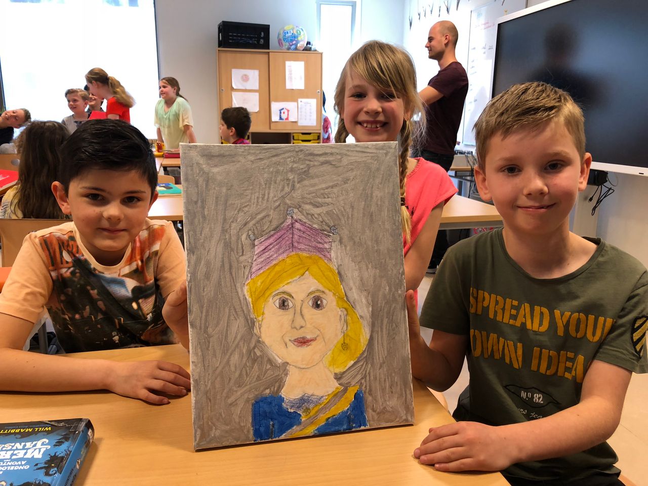 Maar hoe trots meester Bas ook is, de kinderen blijven toch kritisch op hun meesterwerken. Isis: "Ik vind het schilderij wel mooi geworden, maar de ogen van Máxima zijn iets te groot."