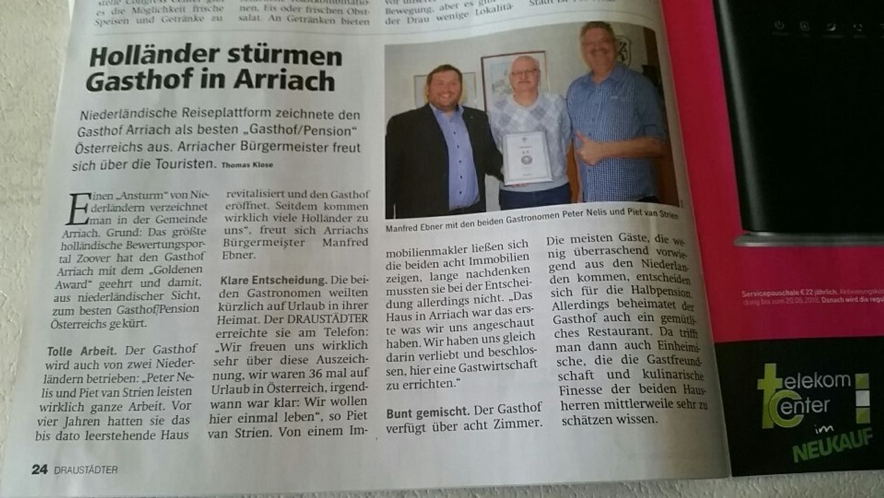 Dat was ook Zoover.nl niet ontgaan. Het grootste reisplatform van Nederland riep deze week Gasthof Arriach uit tot het beste van Oostenrijk. "Met score van 9,8 op een totaal van 10 punten", aldus een trotse Peter.