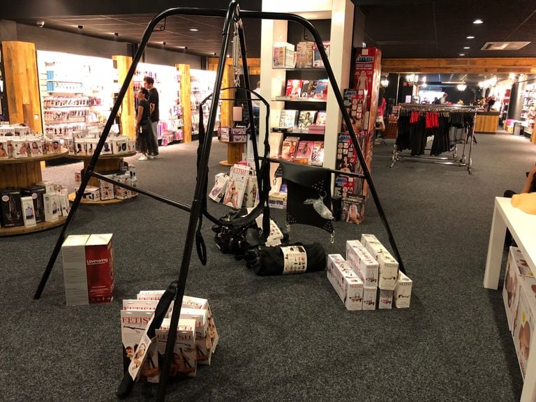 Achterin de winkel. Tepelklemmetjes, zweepjes, anaalspeeltjes, fetishisme. En, wijst Peggy aan: de love-swing. "Je gaat erin zitten, benen er doorheen en je kunt schommelen. Met kinderen zul je 'm niet snel in de woonkamer zetten."