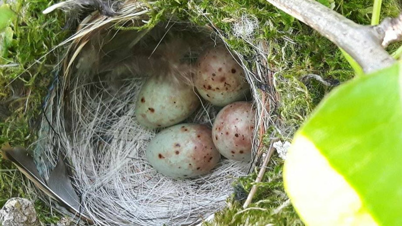 Op de foto die ik kreeg van Odette Keppel zie je een mooi rond nest waarbij de wanden zo te zien stevig zijn aangedrukt. Er liggen vier eieren in. Dit nest is gemaakt door een lijsterachtige vogel, want die duwen de wanden met de borst zo mooi rond. De eieren hebben een blauwe tint - net zoals die van de merel - maar er zit een rode waas aan de onderzijde. Dan heb je te maken met eieren van de grote lijster.