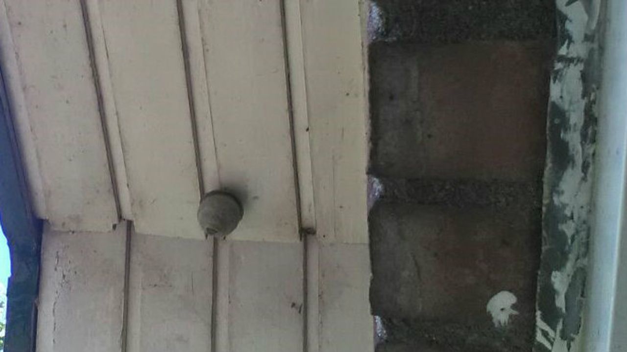 Op de foto die ik kreeg van Ed van Puijenbroek zie je tegen het plafond een bolletje met aan de onderkant een gaatje. Ed vraagt zich af wat dit is. Hij ziet daar aan het plafond het begin van een wespennest. De wespenkoningin schraapt met haar kaken hout van onbewerkt hout en maakt daar een papje van.