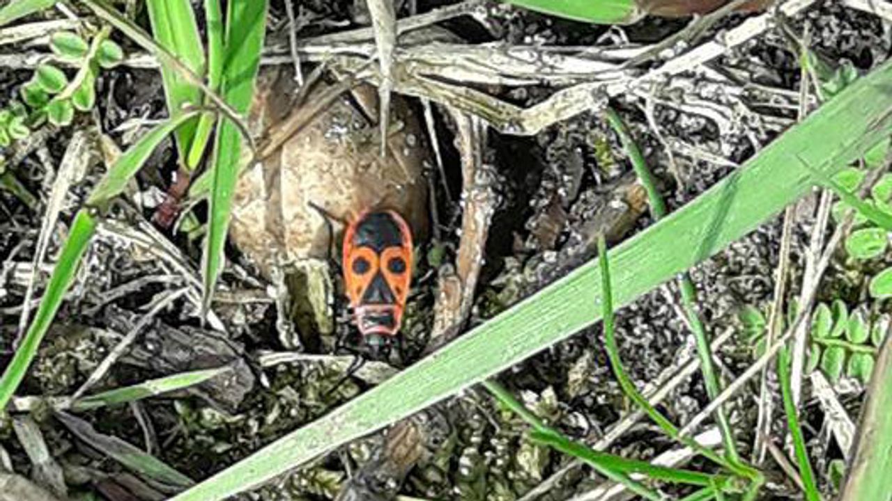 In het midden van de foto van Mies Matheeuwsen zie je een roodgekleurd insect met twee zwarte punten en ook nog wat zwarte vlekken die samen op een Afrikaans masker lijken. Mies dacht aan een soort kever, maar dat is het niet. Het is een insectensoort uit de familie van de wantsen. Vaak kun je ze herkennen aan een driehoekig deel direct achter de kop.