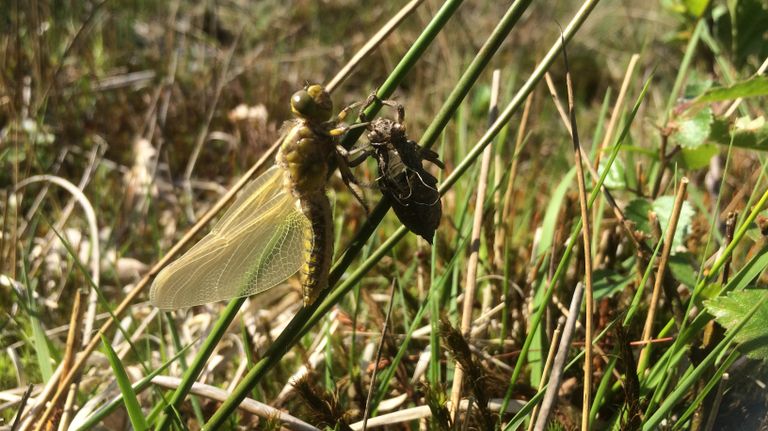 Libellen hebben een onvolledige gedaanteverwisseling. Uit een ei komt een diertje gekropen dat we een larve noemen, maar die lijkt al heel erg veel op een libel. Op het moment dat ze volwassen wordt, komt zo’n nymf uit het water gekropen. Het houdt zich daar vast met haar poten aan een rechtopstaande stengel en dan barst achter de kop de huid open. Daar komt dan een volwassen libel uit tevoorschijn. Het enige dat ze dan nog moet doen, is de vleugels oppompen. Dan pas kan ze gaan vliegen. Op de foto die ik heb bijgevoegd, zijn de vleugels nog opgevouwen en zie je ook het huidje waaruit ze gekropen is.