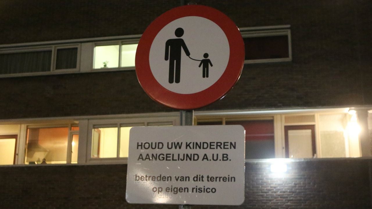Een opvallend verkeersbord bij een speeltuintje aan de Willem Barentszstraat in Den Bosch. Op het bord wordt een volwassene afgebeeld met een aangelijnd kind. Of bezorgde omwonenden de ouders willen waarschuwen voor weglopende kinderen, is niet duidelijk.