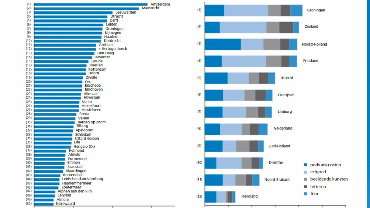 De ranglijst is te vinden in de nieuwe 'Atlas voor Gemeenten', die woensdagmiddag in Leeuwarden wordt gepresenteerd. Bij het opstellen van de cultuurindex van gemeenten en provincies is gekeken naar de omvang en variatie in het culturele aanbod. Dit aan de hand van twintig indicatoren op de gebieden podiumkunsten, erfgoed, beeldende kunst, letteren en film.
