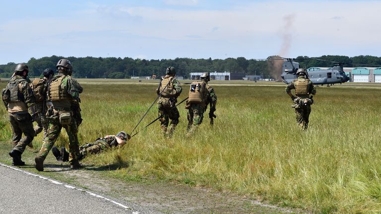 Het is een indrukwekkend gezicht. Helikopters en F-16's vliegen vanaf Vliegbasis Gilze-Rijen naar drie oefengebieden in Nederland en België. "We leren militairen met deze oefeningen om hun collega's te redden in allerlei situaties", vertelt luitenant-kolonel Bart Holewijn. "Bijvoorbeeld een piloot die is neergeschoten. Of een landmachteenheid die met een voertuig op een mijn is gereden en zelf niet meer verder kan."