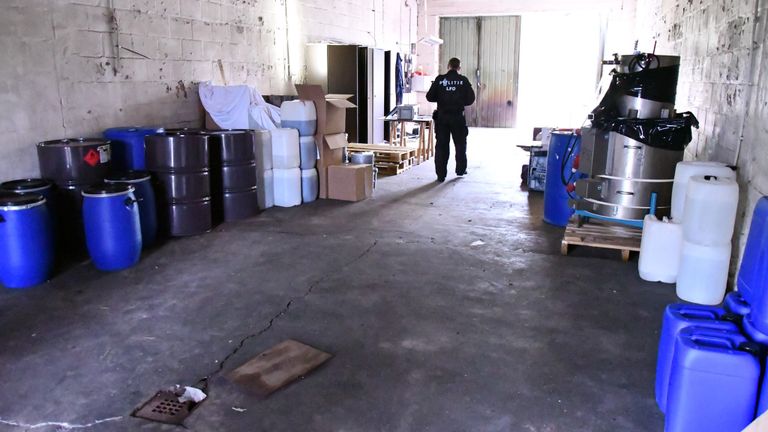 Volgens een woordvoerder gaat het om 25 vaten en jerrycans met een paar duizend liter chemicaliën voor mdma of amfetamine. Ook zijn zogenoemde drukvaten gevonden waarin de drugs kunnen worden gemaakt.