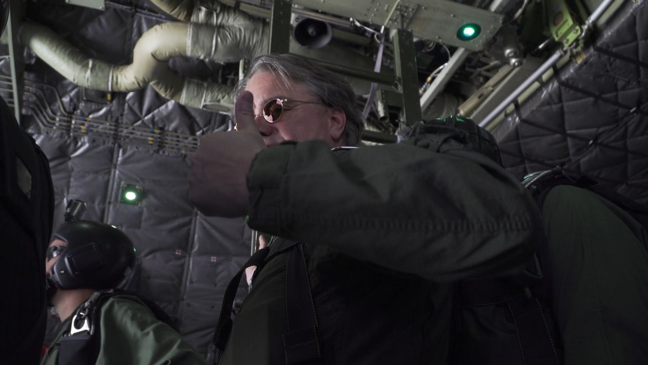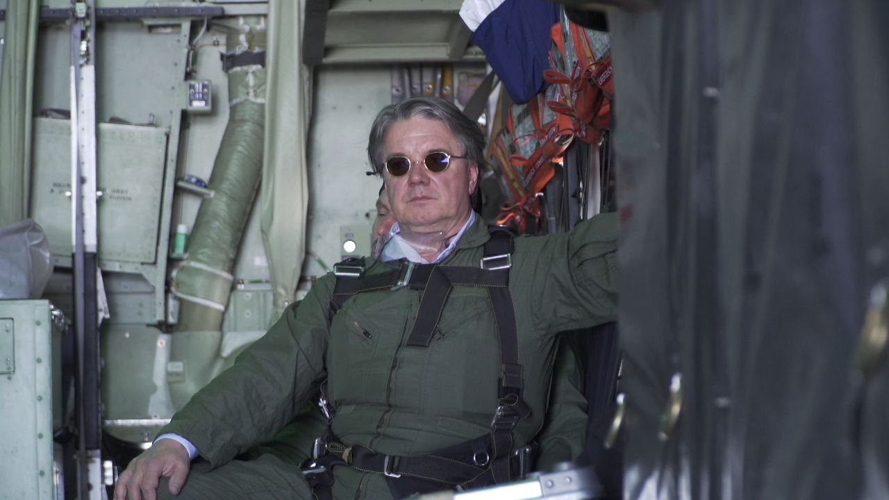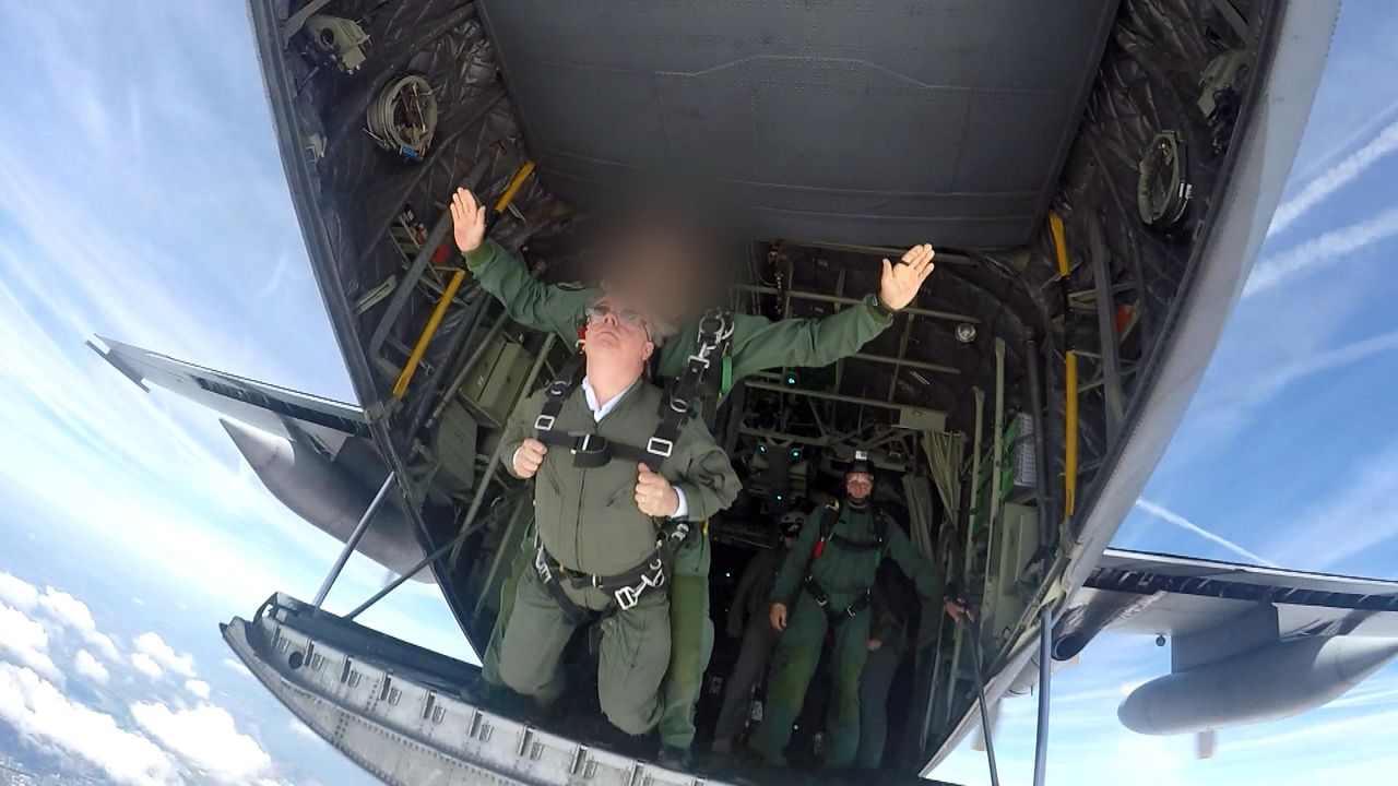 Vlak voor Van de Donk zichzelf uit het vliegtuig gooit, steekt hij nog even zijn duim op. Normaal is hij strak in pak, nu draagt hij een legeroutfit. Zonder ook maar enige twijfel, springt hij. Hij geniet zichtbaar van de tandemsprong. Hij zwaait vrolijk naar de camera, terwijl hij naar beneden valt.