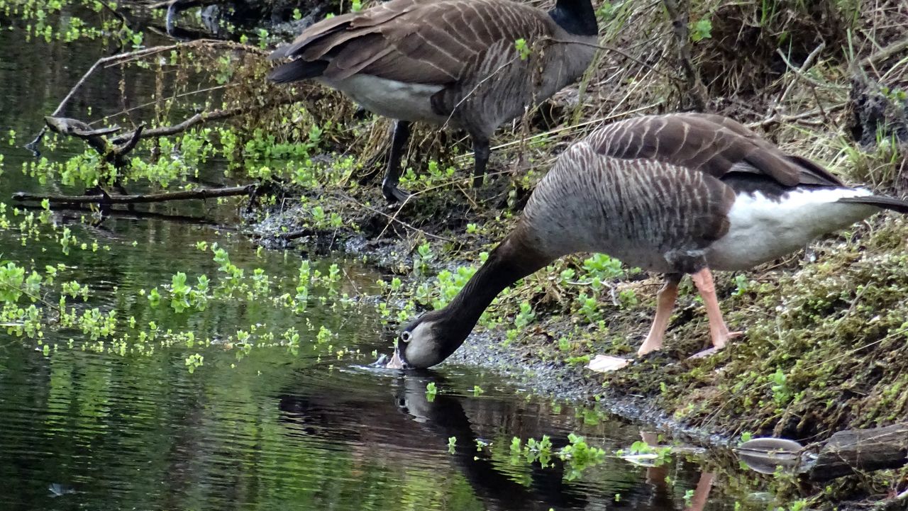 Op de foto die Loes Westgeest instuurde, zie je een gans. Maar wat voor een? Loes denkt dat het een kruising is tussen een grauwe gans en een Canadese gans en volgens mij heeft ze gelijk. Deze gans heeft alle kenmerken van een Canadese gans: een zwarte nek, een lichte grote vlek bij het oog en een bruin verenpak. Maar de roze poten en de roze snavel horen niet bij Canadese ganzen, want die hebben zwarten poten en zwarte snavel. Overigens is zo’n kruising niet echt verrassend, want Canadese ganzen kruisen wel vaker met andere ganzen.