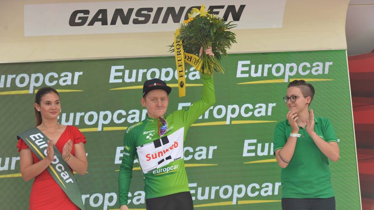 Sam Oomen reed tijdens de Ronde van Zwitserland meerdere keren in de groene trui als beste jonge rijder. Tekst gaat verder onder de afbeelding.