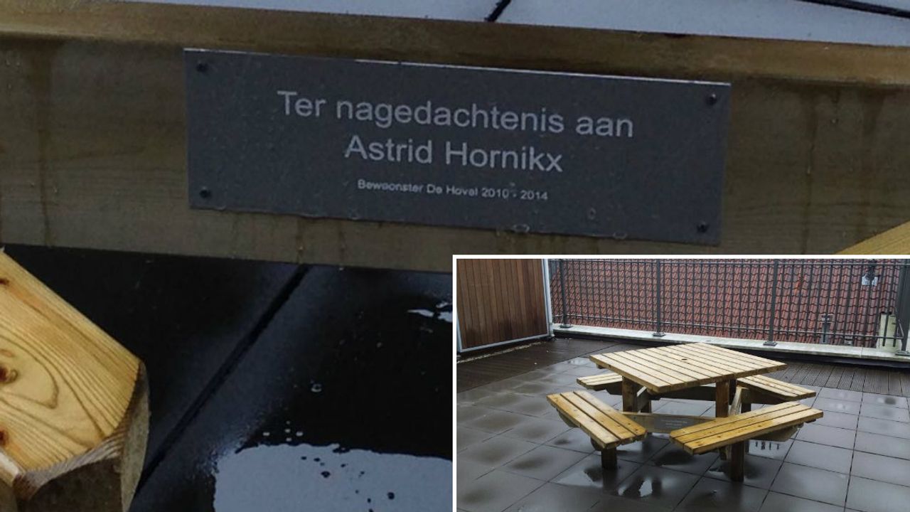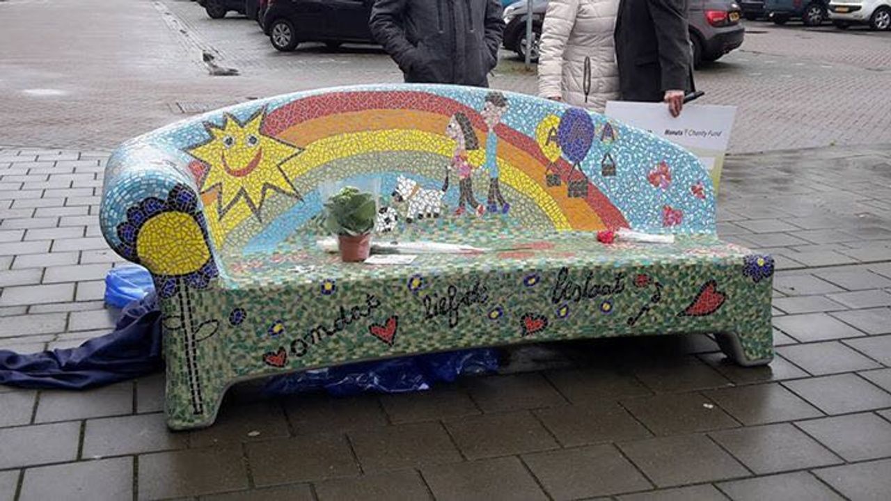 Astrid Hornikx en Bart Lambregts werkten allebei in het onderwijs. Bij de school van Astrid in Tilburg staat een herinneringsbankje met daarop een mozaïek van tekeningen van leerlingen.
