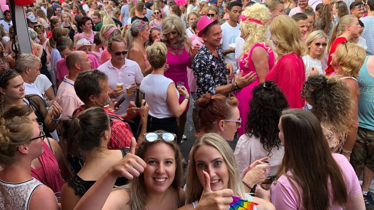 14.45 uur: Het begint langzaam druk te worden, het is zowel qua sfeer als qua temperatuur 'dampend heet'. Het feestje voor homo's trekt ook veel niet-homo's, aldus de verslaggever ter plaatse. Veel terrassen zitten al vol. "Altijd gezellig, Roze Maandag", aldus een paar Belgen. "De sfeer maakt het echt bijzonder."