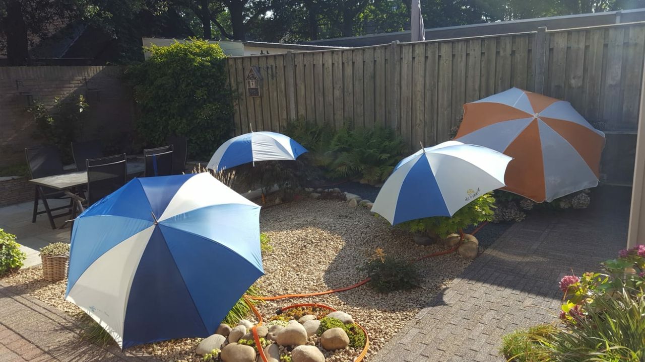 Maar op de juiste manier sproeien is niet de enige tip. Zo heeft de Tuynkamer de meest zongevoelige planten onder een parasolletje gezet. En voor de zijramen van de orangerie zijn lakens opgehangen. Toch doet ook de tuin van Anne Marie het niet slecht. "We hebben nog nooit zoveel rozen gehad en het wemelt van de vlinders." En verder? Gewoon bidden om regen.
