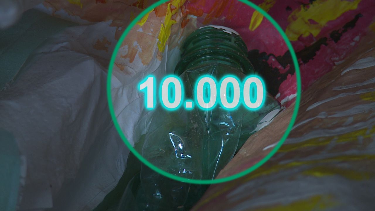 De plasticsoep bestaat uit maar liefst 10.000 groene flesjes die groenachtig van kleur zijn. “Heel Schijf drinkt mee”, zegt Mariska van Nijnatten.