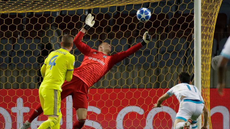 '5 Weer dreiging van BATE Borisov. Doelman Jeroen Zoet is attent en voorkomt echt gevaar.