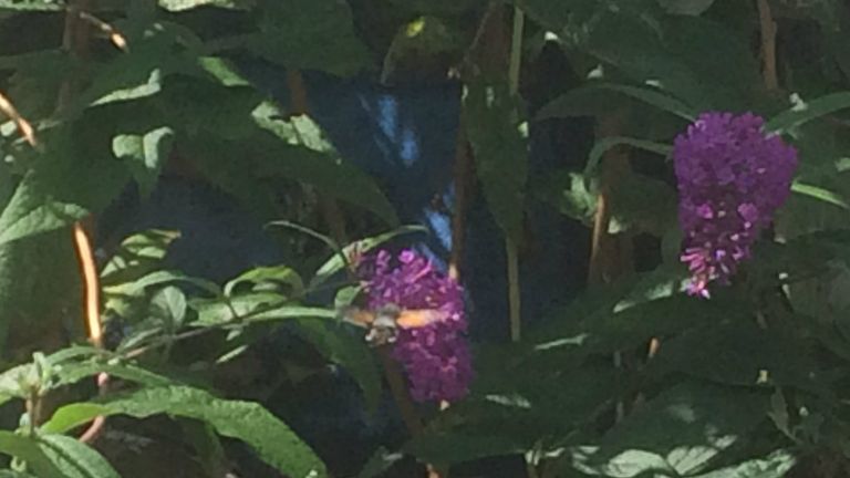 Op de zeer vage foto van Peter de Vaan zie je - als je goed kijkt - een insect voor een bloem hangen. Als je die een beetje dichtbij haalt, kun je zien dat het een kolibrievlinder is en dus geen bij of wesp, zoals Peter dacht. Dit jaar zijn er overigens heel veel kolibrievlinders gemeld. Wellicht heeft dit te maken met de extreem hoge temperaturen, want in principe zijn dit trekvlinders die in mindere mate ons land aan doen.