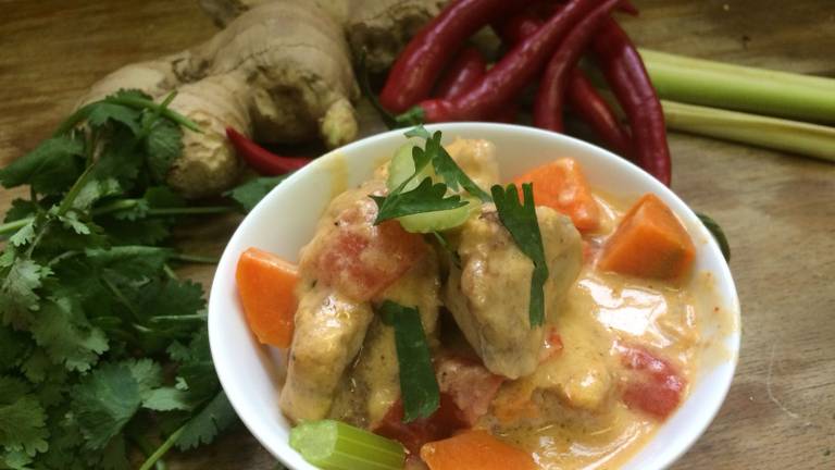 Laat alles lekket pruttelen totdat de kip gaar is. Ondertussen heb je tijd om de witte rijst te koken.