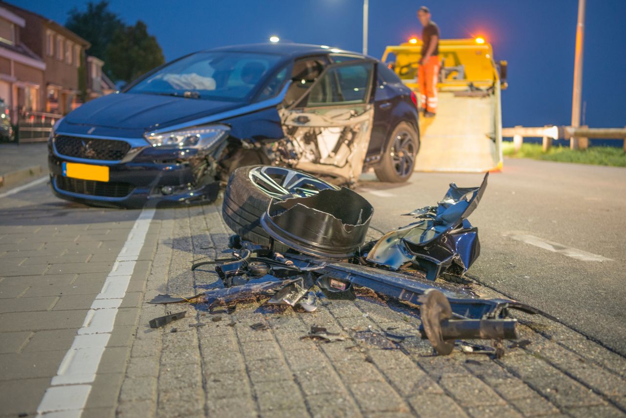Racewagen op aanhanger crasht bij Nieuw-Vossemeer, personenauto zwaar beschadigd