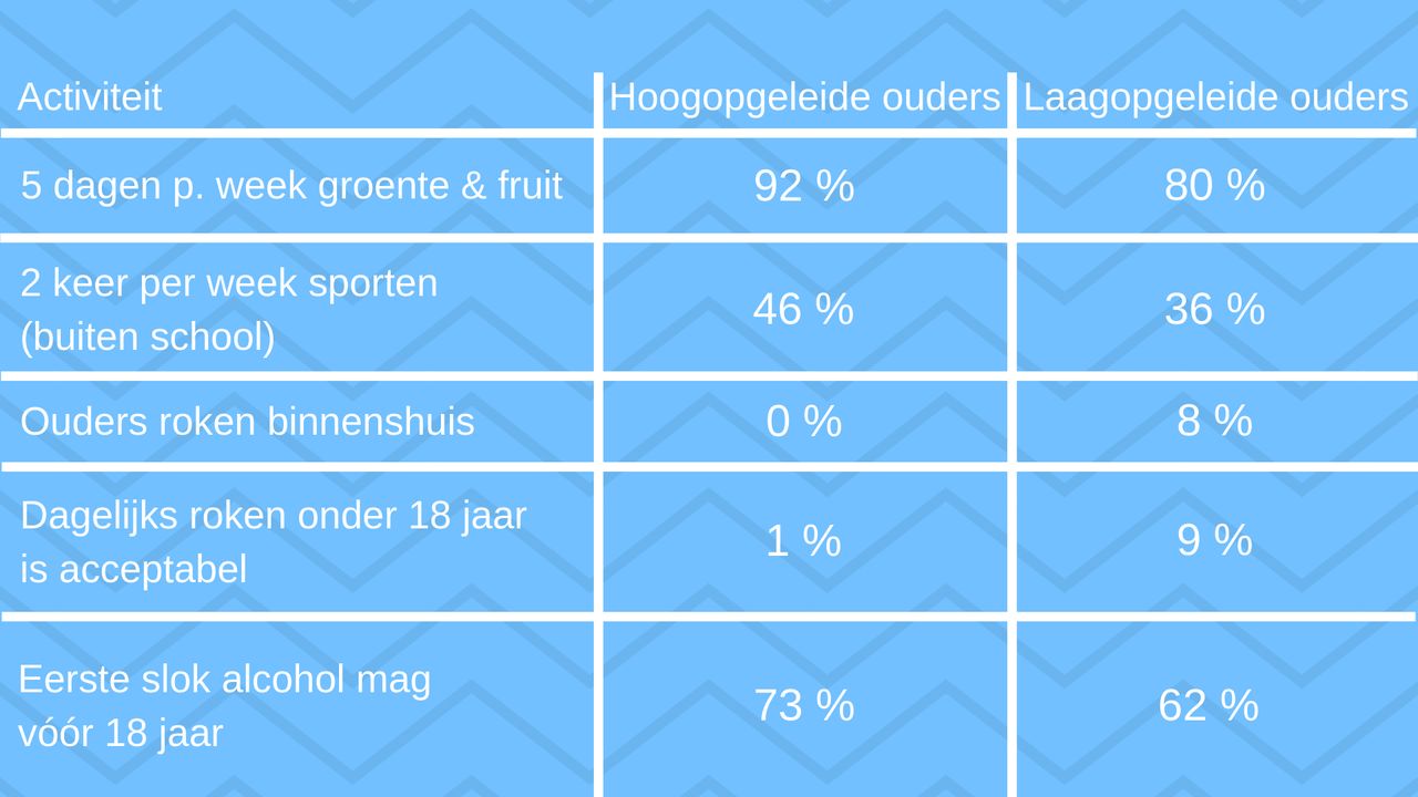 Maar liefst 98 procent van alle Brabantse kleintjes ontbijt iedere dag. Kinderen eten bovendien vaker groente en fruit. 92 procent van de kinderen van hoogopgeleide ouders eet minimaal vijf dagen per week groente en fruit. Bij laagopgeleide ouders is dat 80 procent.
