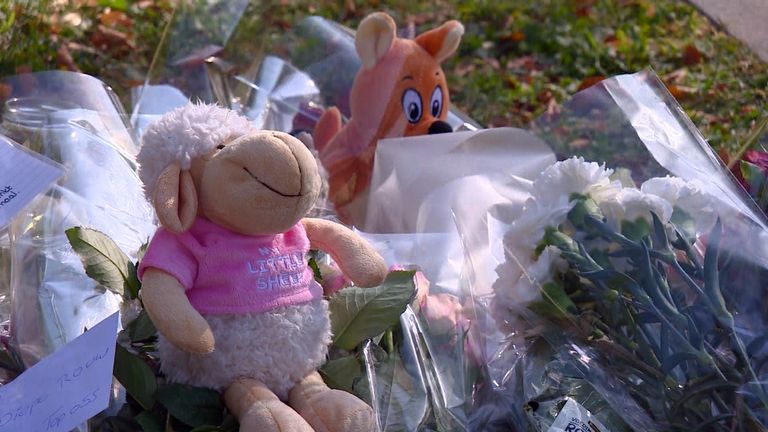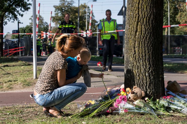Een moeder legt bloemen neer met haar dochtertje van twee. "Ik vind dit heel heftig." Ze kijkt naar haar dochtertje. "Dit nieuws komt extra hard binnen. Zij gaat ook naar een kinderdagverblijf."