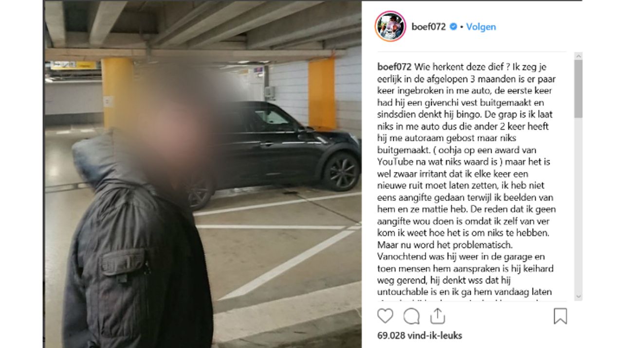 Boef lost het voorlopig zelf op zonder hulp van de politie. Op zijn Instagram plaatste de Tilburger een foto van de vermoedelijke dader. "Ik ga hem laten zien dat hij het beter niet had kunnen doen. Ik wil vandaag nog zijn gegevens tot aan zijn schoenmaat. Dan ga ik vanavond nog langs zijn ouders om te praten."