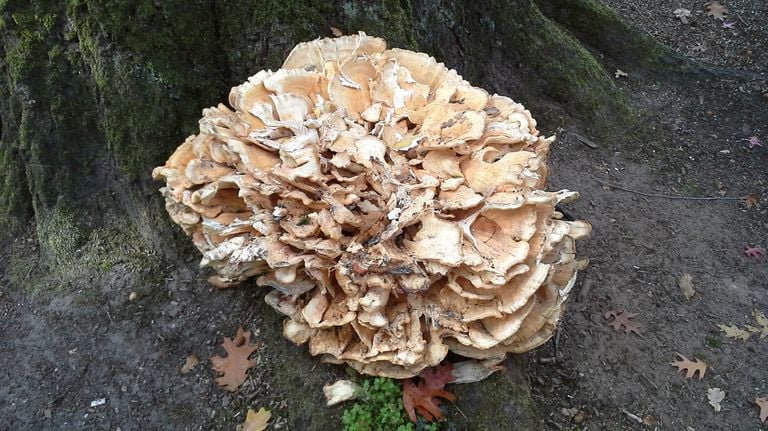 Op de foto van Ida van der Reijt staat een zeer grote gele zwam. Ida vroeg zich af of dit een eikhaas is. Dat is het niet, maar het is wel een andere boomzwam: de reuzenzwam. De reuzenzwam heeft grote waaiervormige platte vruchtlichamen. Je ziet deze zwam - meestal aan de voet van een boomstam - vaak al op enkele meters afstand. Reuzenzwammen zij echte parasieten, die zich in een korte periode van enkele jaren over het hele wortelstelsel uitspreiden. Ze tasten het wortelstelsel aan, maar niet de stam Beuken, paardenkastanjes, hazelaars en Amerikaanse eiken zijn bomen die hier veel last van hebben. Vooral verzwakte oude beuken zijn vaak de klos.