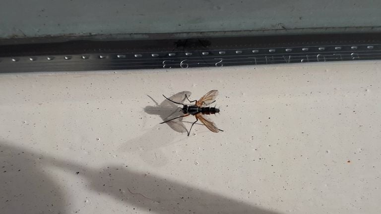 Op de foto die ik kreeg van Ad van der Doelen zie je een donkergekleurd insect. Wat meteen opvalt, zijn de twee vleugels, dus dit insect behoort tot de tweevleugeligen. Deze orde heeft wereldwijd honderdduizenden soorten. Die zijn op te splitsen in twee hoofdgroepen: vliegen en muggen. Lastig is dat ze soms moeilijk uit elkaar te houden zijn. Je hebt namelijk mugachtige, fijngebouwde vliegen en ook vliegachtige, zwaargebouwde muggen. Een ding hebben ze zeker gemeen: het zijn vaak zeer goede vliegers. Persoonlijk denk ik dat de tweevleugelige op de foto een vlieg is, behorend bij de familie van steltvliegen, maar ik ga dit nog uitzoeken.