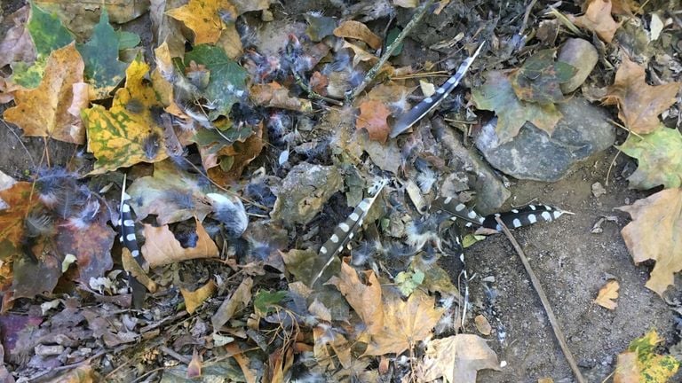 Op de foto die Annemarije instuurde, zie je wat zwarte veren met witte vlekken liggen. Die witte vlekken zijn een beetje rond en dus gaat het vermoedelijk om de resten van een grote bonte specht. Deze grote bonte specht is waarschijnlijk gepakt door een havik, een sperwervrouwtje of een bosuil. Grote bonte spechten zijn zwakke vliegers, dus als ze op de grond zitten of niet opletten, zijn ze snel te pakken door roofvogels. Ik heb weleens gezien dat een havik in een snelle vlucht zo een specht van de boom plukte!