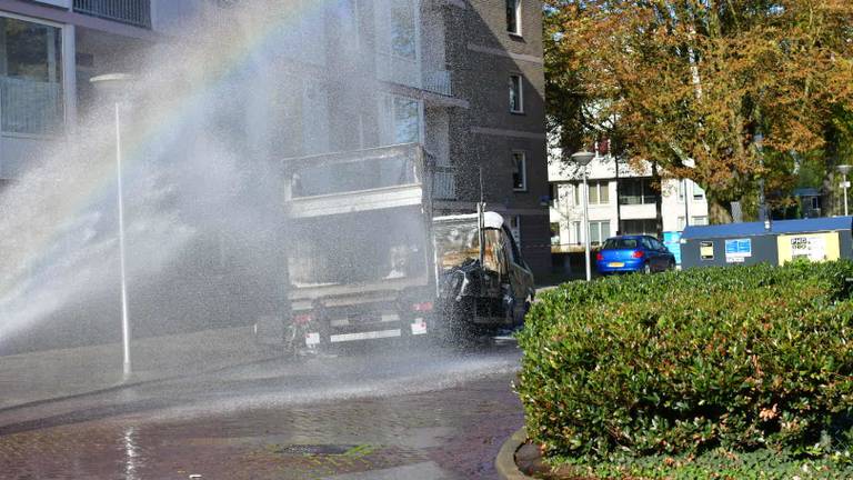 De vrachtwagen staat naast een appartementencomplex. Dat is vanwege de giftige dampen ontruimd.