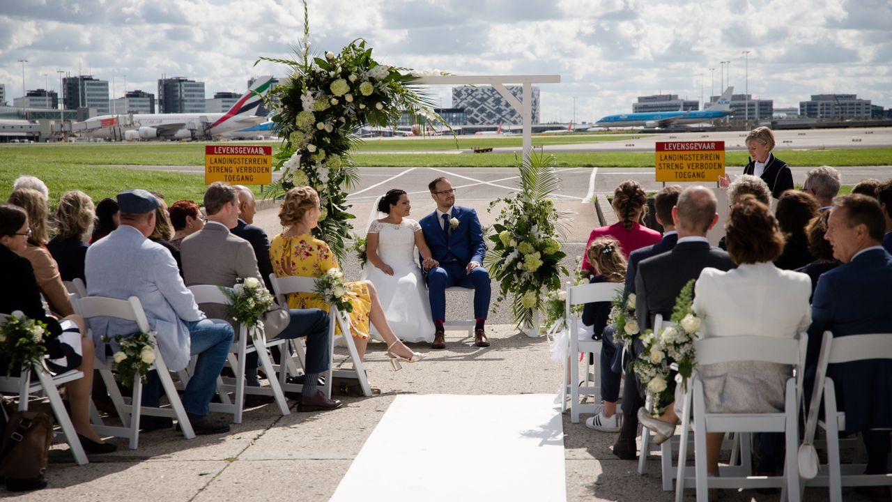 "Maar het hoogtepunt van de dag was de ceremonie. Alle verrassingen waren heel mooi, maar het moment zelf, toen we daar stonden en elkaar de geloften voorlazen, dat was toch wel heel bijzonder." Dat gebeurde in de brandweerkazerne op het vliegveld. "Vlakbij de Buitenveldertbaan De gasten zag ons aan komen lopen met die landingsbaan op de achtergrond."